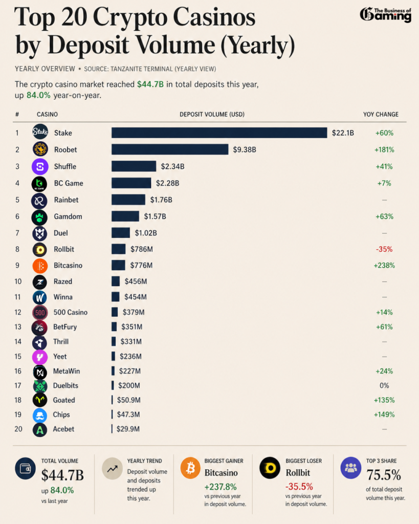 The Business of iGaming üzerinden paylaşılan Tanzanite Terminal verileri çarpıcı bir tabloyu ortaya koyuyor. Kripto kumarhaneler, son bir yılda toplam 44,7 milyar dolarlık mevduat hacmine ulaştı. Bu rakam yıllık bazda yüzde 84 artışa karşılık geliyor.